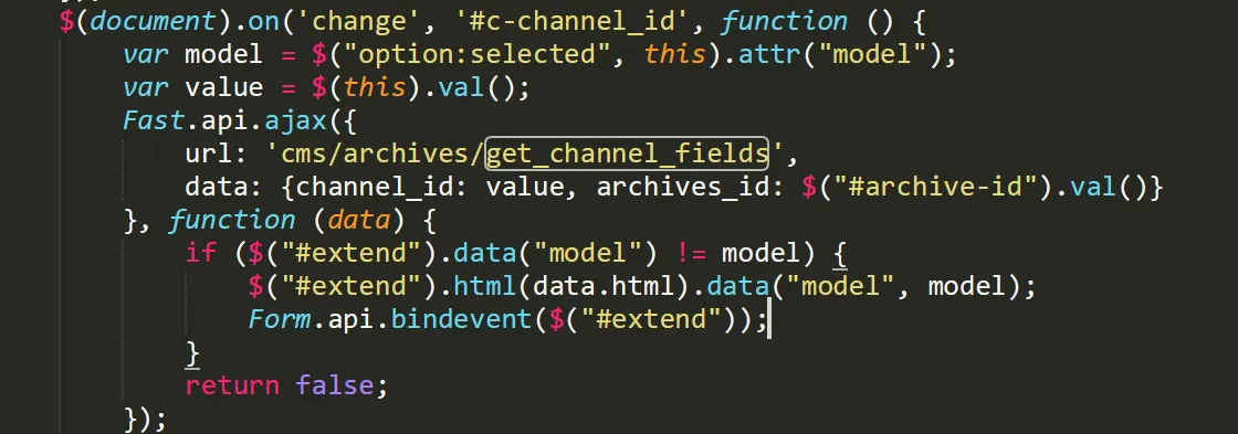 定义了选择不同的栏目,就通过ajax方式调用cms/archives/get_channel_fields。这里使用了$this->success方法